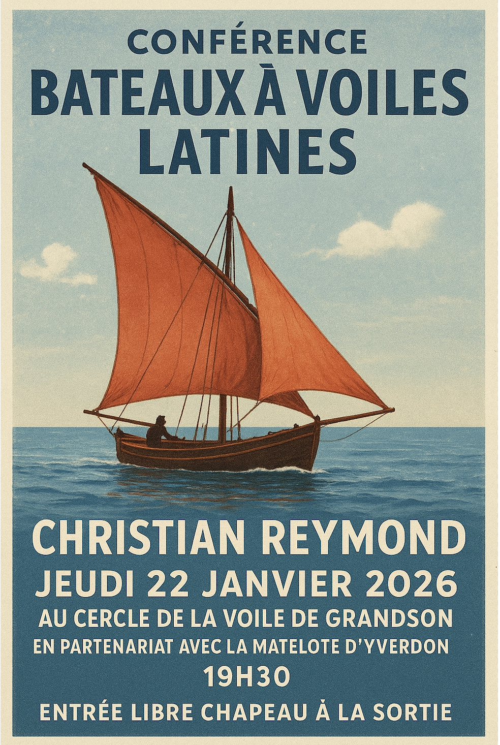 Au moment où la demande d’inscription de l’art des voiles latines lémaniques au patrimoine immatériel de l’humanité est examinée par l’UNESCO, cette conférence a pour but de retracer leur histoire. Il s’agit aussi d’expliquer comment deux barques ont survécu et quatre autres reconstruites au début de ce siècle et comment des centaines de bénévoles les font encore vivre aujourd’hui.