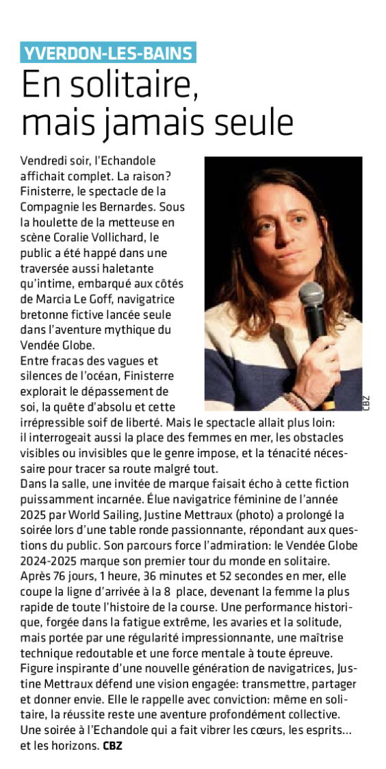 Solitaire mais jamais seule : une soirée au large des émotions. Spectacle à l’Echandole en présence de Justine Mettraux, vendredi 16 janvier